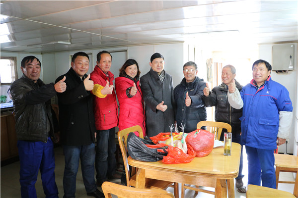 在视察、慰问过程中,李景辉副总经理首先代表董事长傅炳荣、副董事长傅瀛等公司领导向船务和油库的全体职工们致以最亲切的慰问和节日祝福,并代表公司送上了鸡、鱼、肉等丰富的传统佳节必不可少的年货,让大家感到了家庭般的温暖。